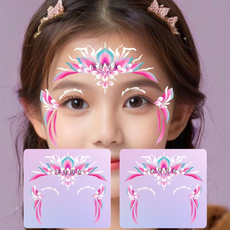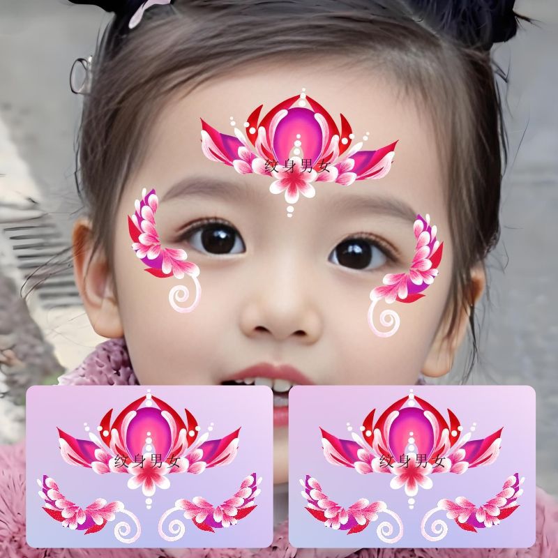 【子供公園カラーステッカー】赤桃姫額と目元のペイントステッカー、手の甲と手首の花のタトゥーステッカー