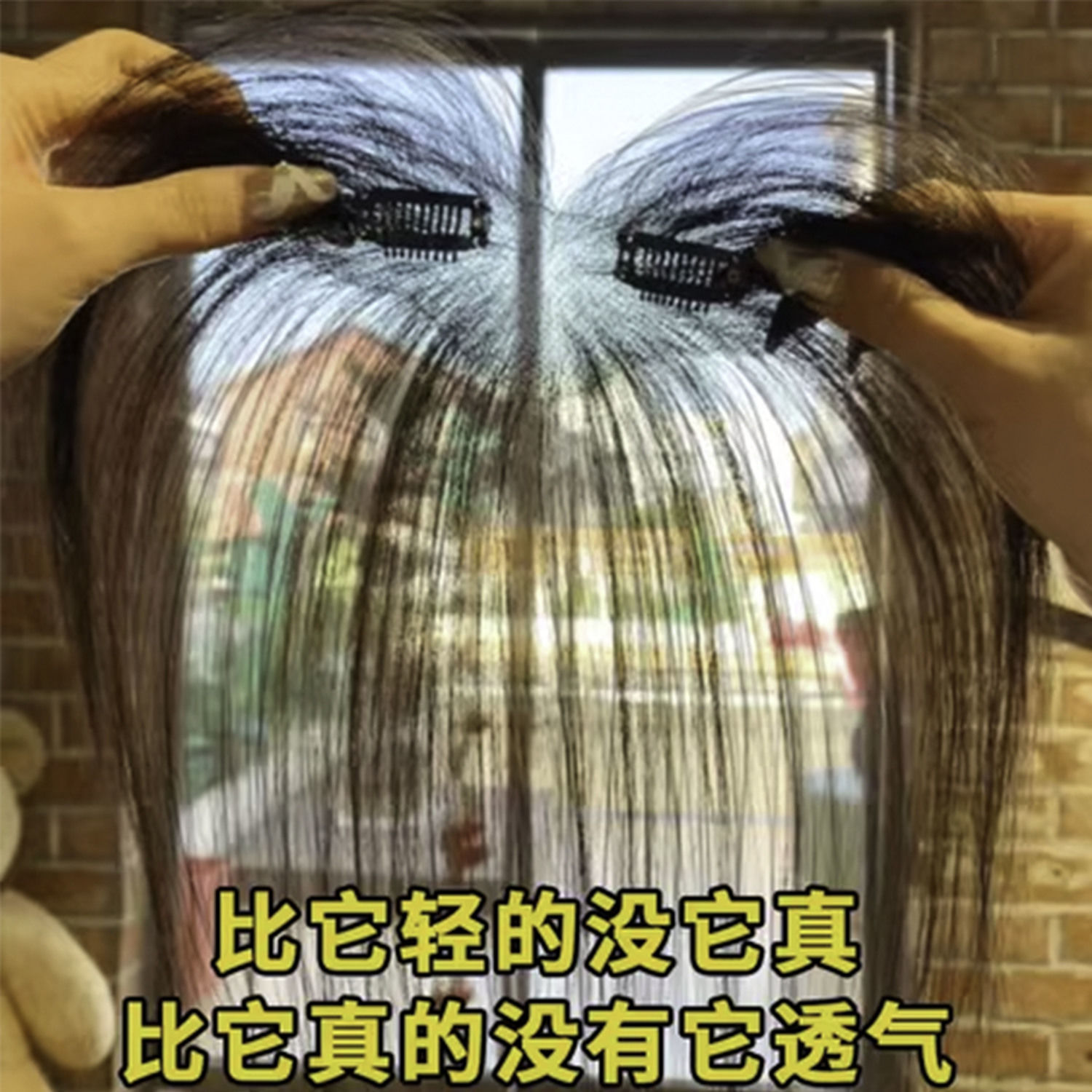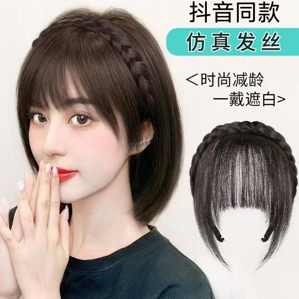 Douyinと同じスタイルの三つ編みヘアフープ、前髪一体型、本物の髪の額カーテン、白髪をカバーする前髪、前髪ウィッグ
