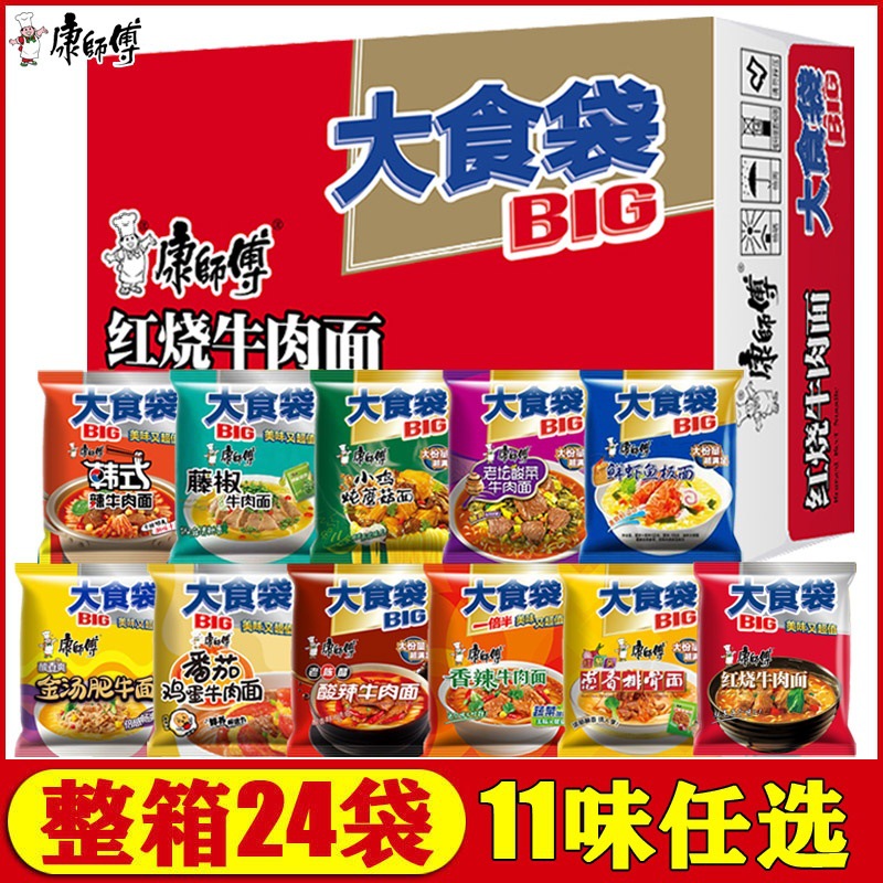 康師傅のインスタントラーメンの大食袋の赤焼牛肉の麺の新鮮なエビの藤椒の24袋の泡麺のインスタントラーメンの箱は全部郵送します。