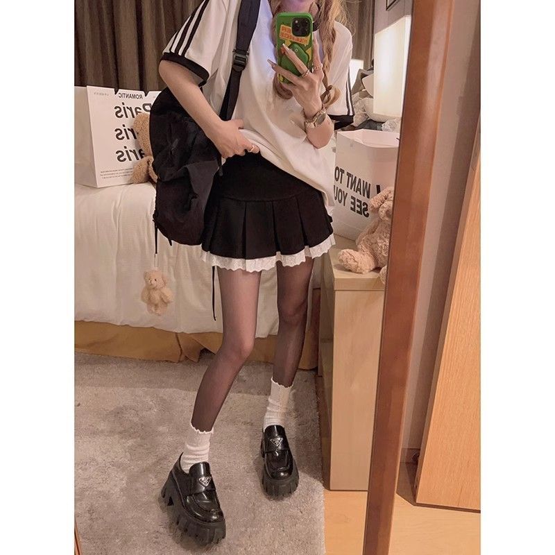 芭蕾风蕾丝拼接百褶裙女夏季时尚百搭防走光短裙高腰显瘦a字裙子