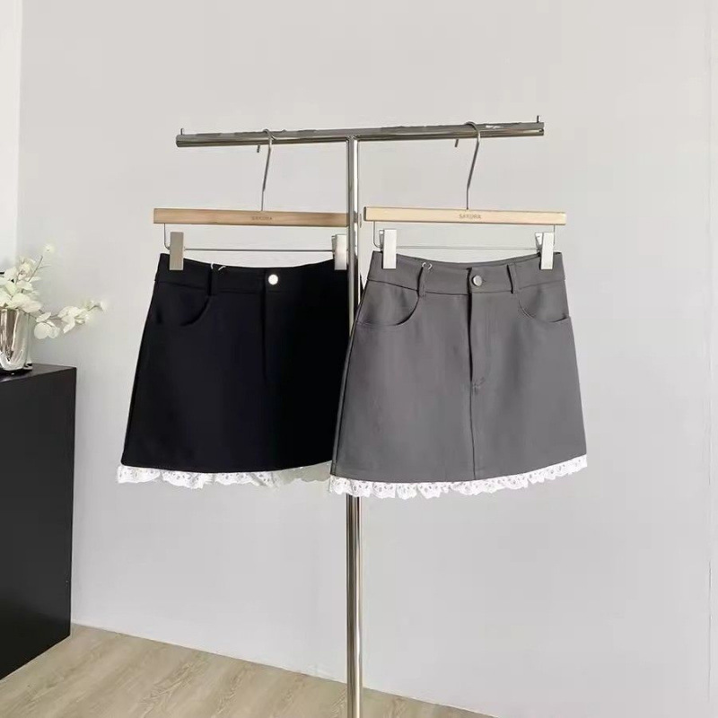 灰色蕾丝边拼接半身裙女夏季时尚高腰显瘦百搭防走光A字包臀短裙
