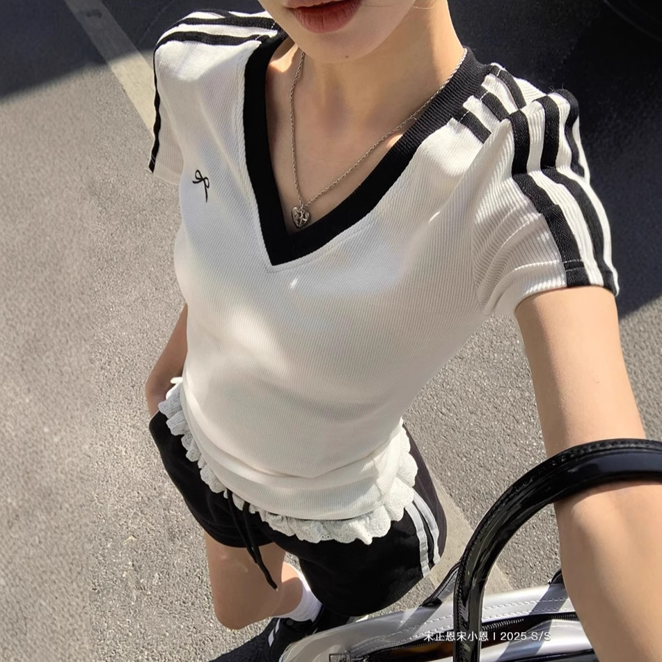 蝶结V领白色正肩短袖t恤女夏季新款纯棉修身短款半袖上衣两件套