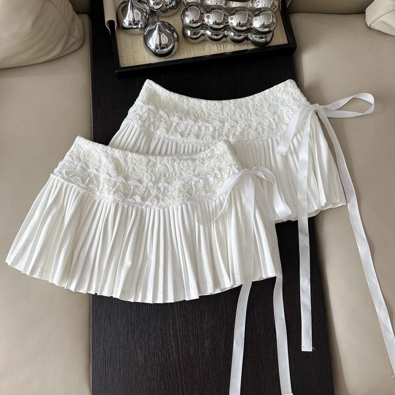 少女感蕾丝拼接百搭蛋糕裙系带半身裙女春季高腰显瘦时尚百褶短裙