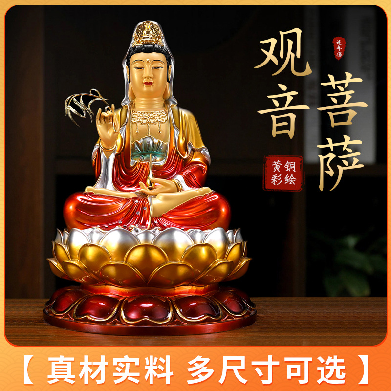 仏堂のお寺は瓶を支えて純粋な黄銅の彩色の観音の菩薩の家庭用は蓮の観音の菩薩の仏像の置物を供えます。