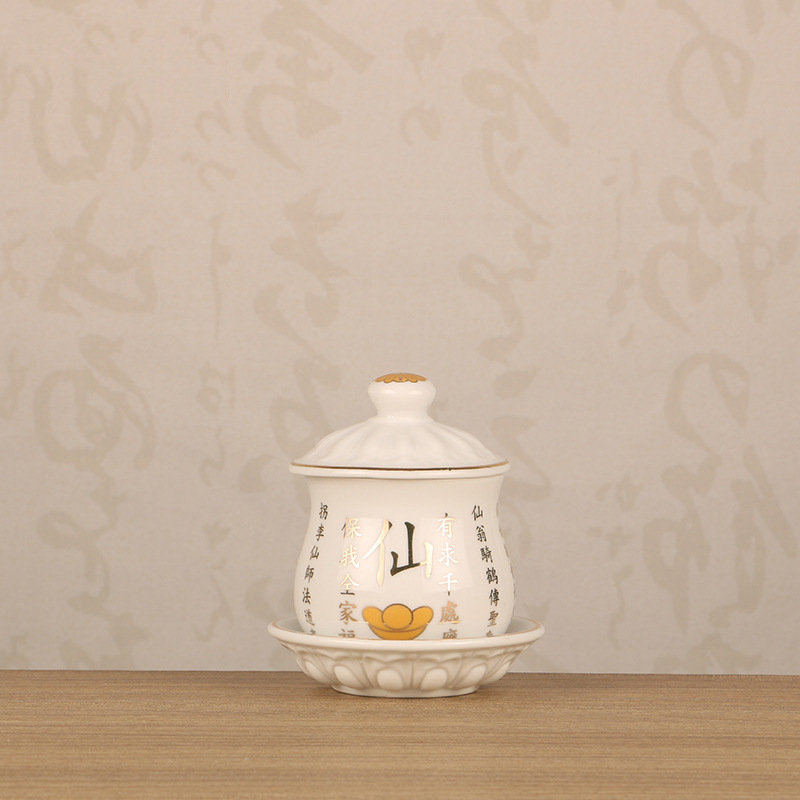 浮き彫りの白い蓮の花の置物陶磁器の聖水杯観音杯の財神杯の字がなくて杯を供えます。