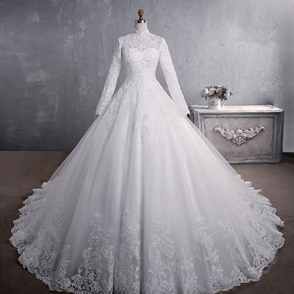 欧米風ウェディングドレス レース 2025年新作 花嫁 スタンドカラー 長袖 スタンドカラー ロングトレーン 大きいサイズ 控えめ クロスボーダーウェディングドレス