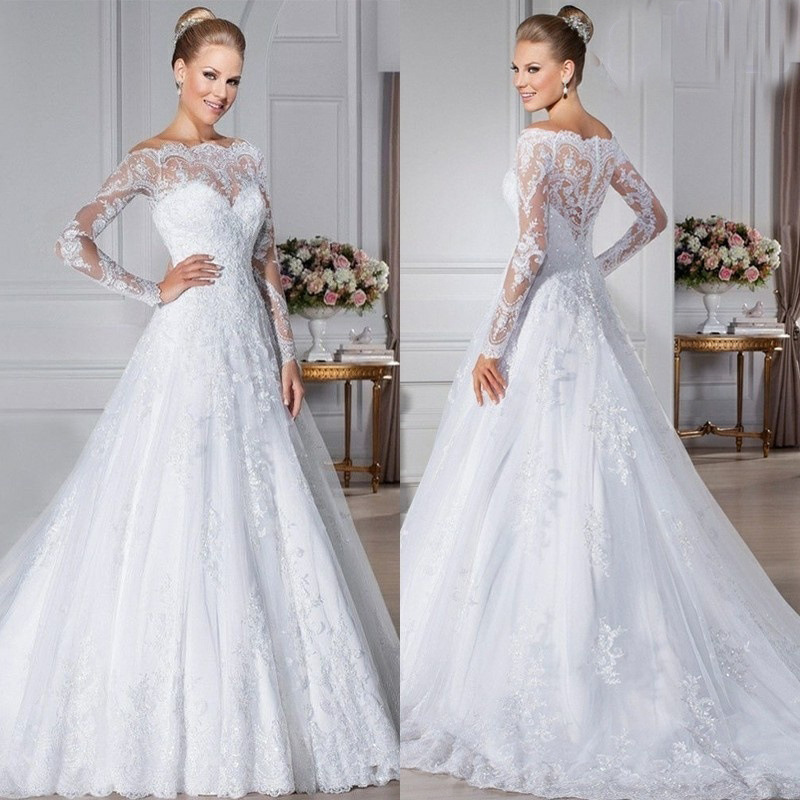 一字の肩のA字がそろっています。長袖のウェディングドレスです。