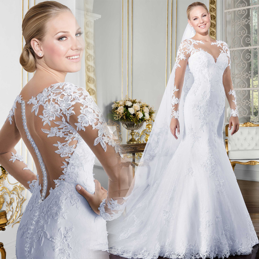 外国貿易のウェディングドレス2024春の速売は新型の欧米の新婦のレースの長袖の魚の尾がやせている主なウェディングドレスを現します。