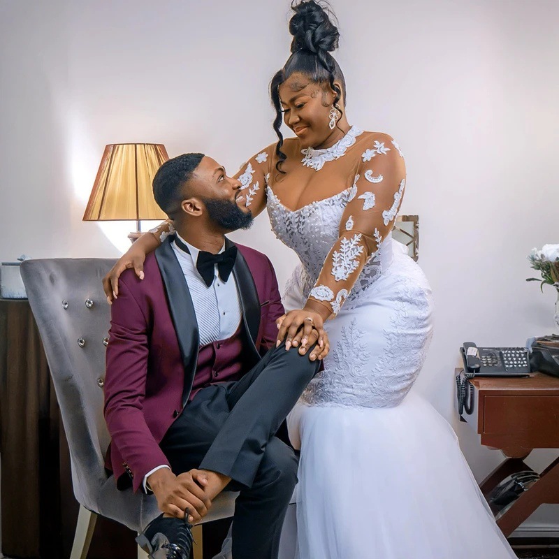 アフリカマーメイドブライダルウェディングドレスハイネックレースアップリケ長袖花嫁ドレスレディフォーマルパーティードレス