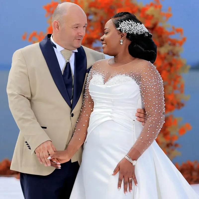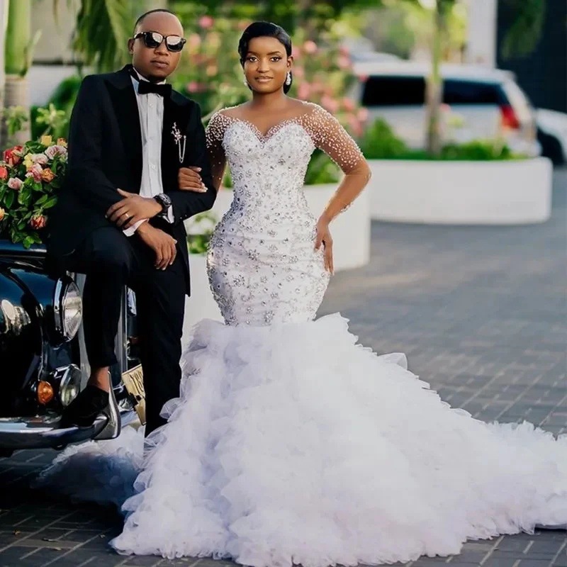 プラスサイズの高級ウェディングドレスブライダルドレス花嫁ドレスアフリカマーメイド長袖ビーズレース真珠