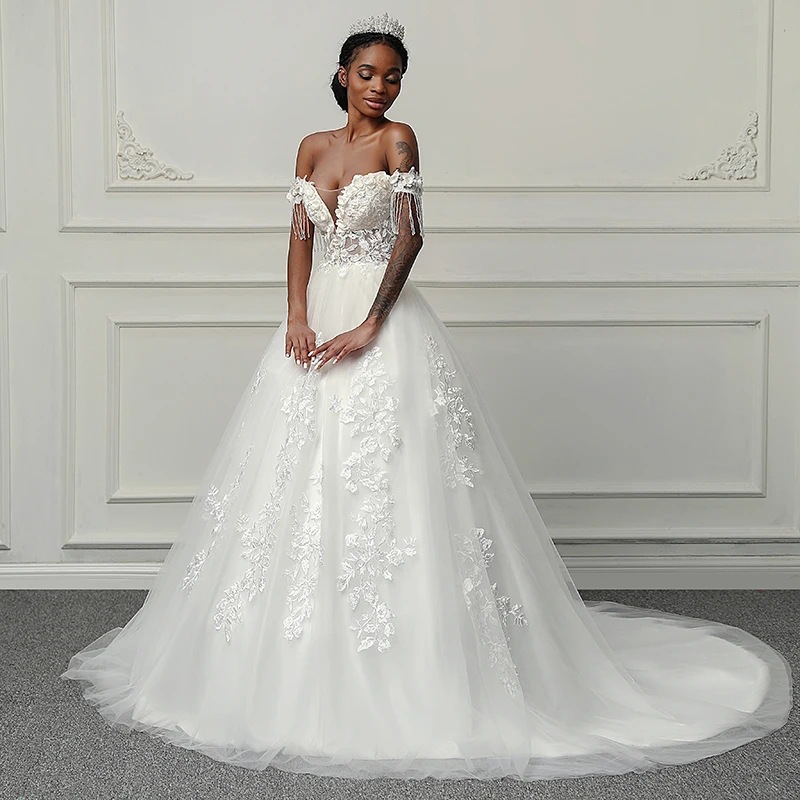 新商品の対外貿易のウェディングドレスのアフリカの新婦の1字の肩のビーズの飾りの尾のひもの高い腰の気質の優雅なドレス
