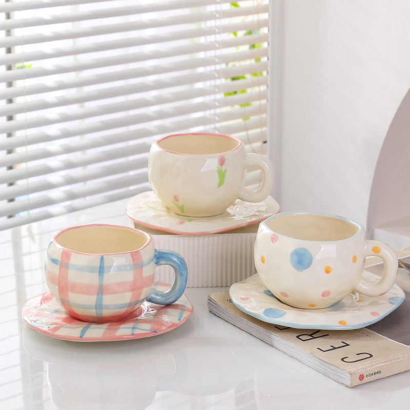 Ins风少女心小さな花セラミックコーヒーカップ皿手握り手描き不规则なカップ皿アフタヌーンティーラテカップ