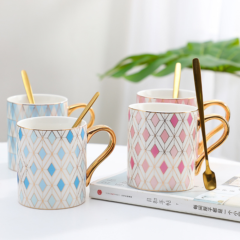 ヨーロッパ式の軽い豪華な陶磁器のマグカップの創意の贈り物の杯の男女のカップルは杯のコーヒーカップの結婚祝いのお土産に対してオーダーメイドします。