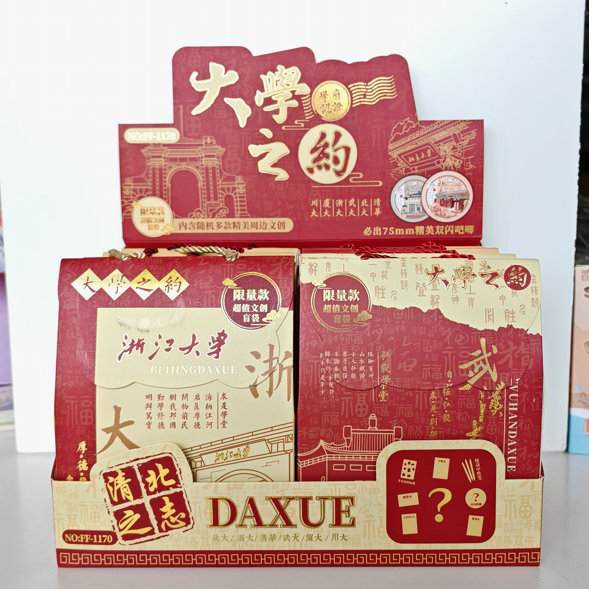 新しい大学の約束クリエイティブビッグブラインドバッグ有名な大学バリューギフトボックスバッジステッカーゲルペンサプライズギフトボックス