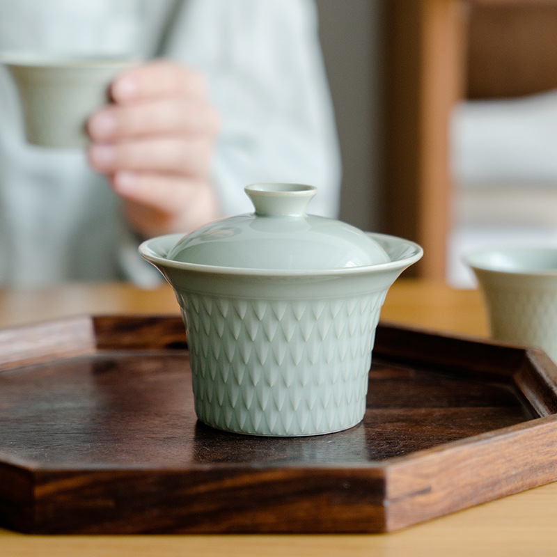 磁器の宋青の手作りの竜のうろこの蓋の陶磁器のレリーフの蓋の碗の工夫の茶器を展示してお茶の碗を入れてお茶の碗を入れます。