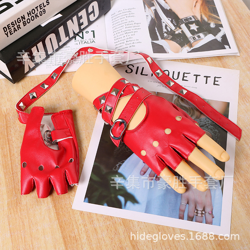 公演半指手袋の女性リベットは本革PUパンクの落雷街舞ダンスクラブのショーcos手袋に似せています。