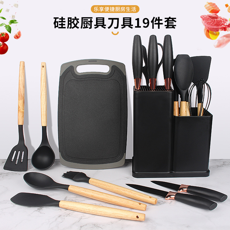 シリカゲル調理器具セット19点セット木柄調理器具セット収納バケツ付き刃物麦わらまな板セット