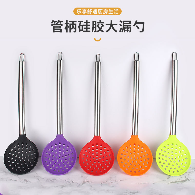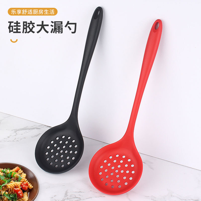 パイプハンドルのシリカゲルの台所のパイプのハンドルのシリカゲルの大きい漏れのスプーンは鍋の濾過油のスプーンをすくいます餃子のスプーンをすくいます。