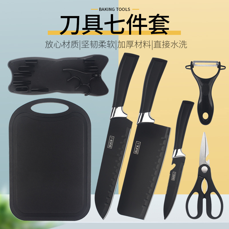 刃物7点セット家庭用包丁シェフナイフ果物ナイフ瓜削り板ハサミセット黒色刃物7点セット