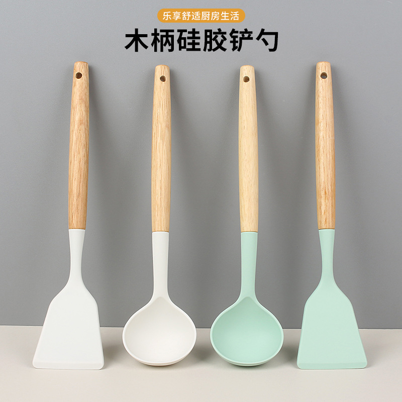 中型木柄シリコンスパチュラとスプーンの2点セットノンスティッククッキングスパチュラとスプーンフライパンスパチュラシリコンキッチン用品セット