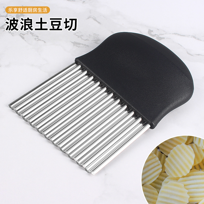 ステンレスの波の刀のジャガイモはフライドポテトを切って台所の小道具を切ります。