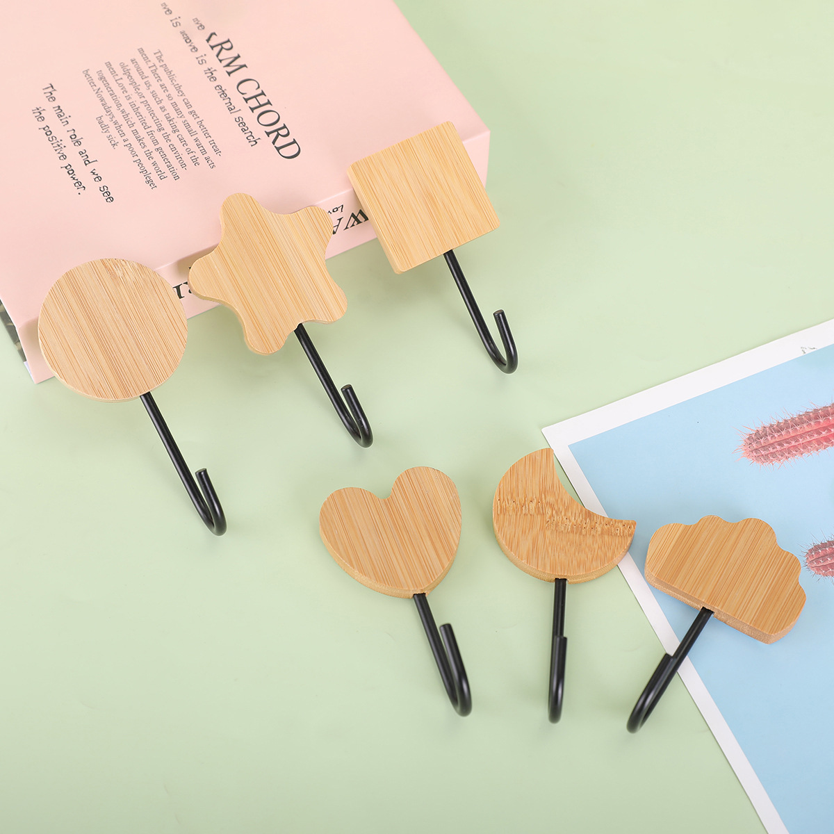 星と月のかわいい形の竹フック、パンチフリードアフック、木製粘着フック、クリエイティブでシンプルな玄関コートフック