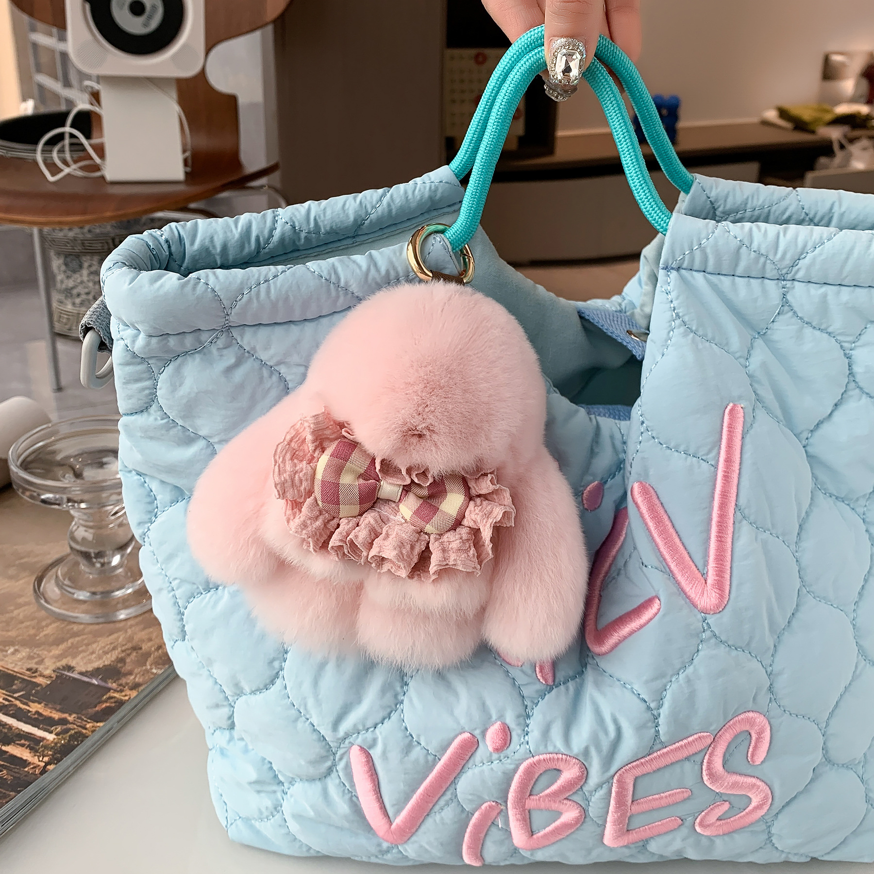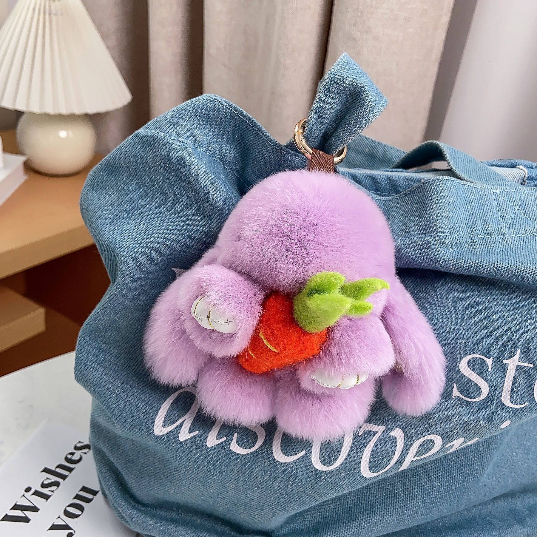 ウサギの毛の真毛は死んだウサギのウサギのペンダントのキーホルダーのベルベットのバッグに飾られています。