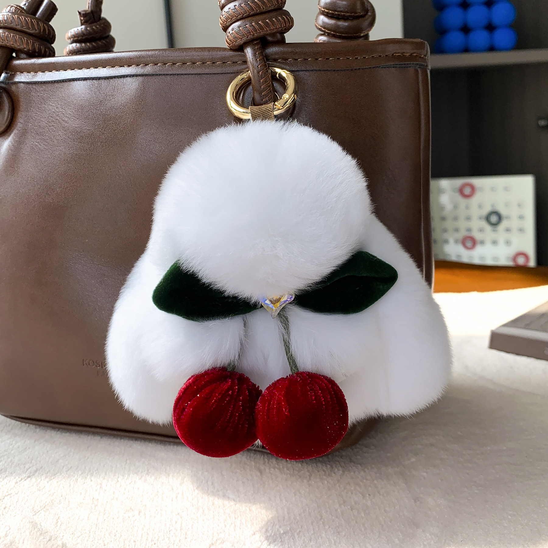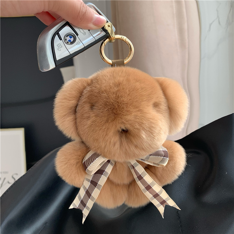 【かわいいヒグマ】本物のウサギの毛バッグにぬいぐるみの人形の車のキーホルダーの誕生日プレゼント