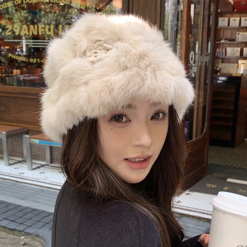 ウールキャップ女性秋冬防寒白色保温帽子東北盆帽耳保護帽顔小漁師帽ぬいぐるみ