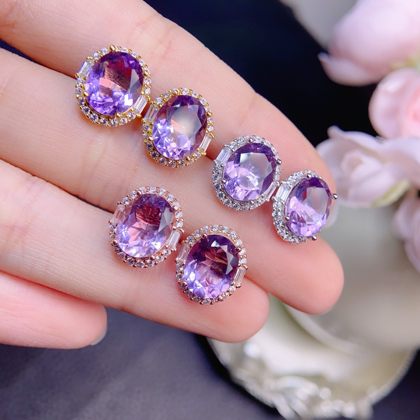 純粋な天然アメジストのスタッドピアス、スーパーカラーベアストーンサイズ8*10mm、ハイエンドs925スターリングシルバー象嵌