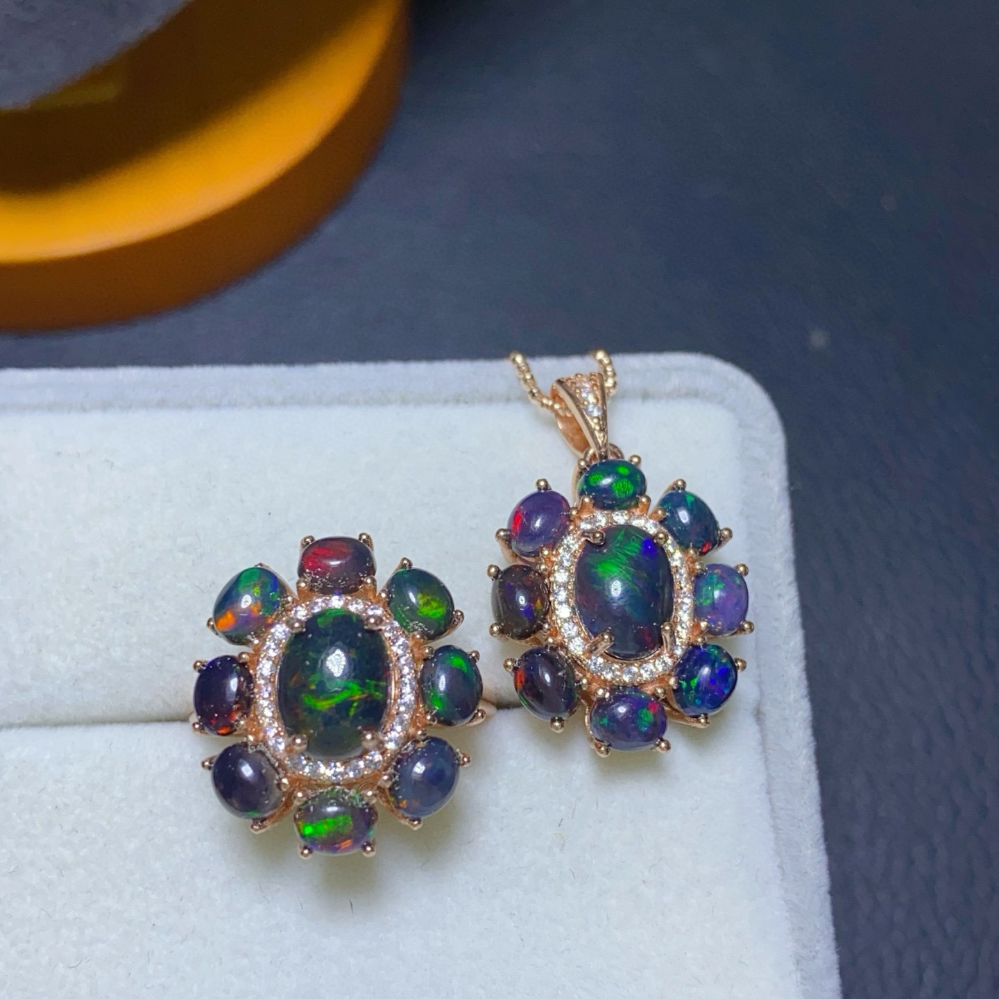 天然カラー黒欧泊セット主石7*9mm 4*5mm925純銀モザイク天然宝石ペンダント指輪