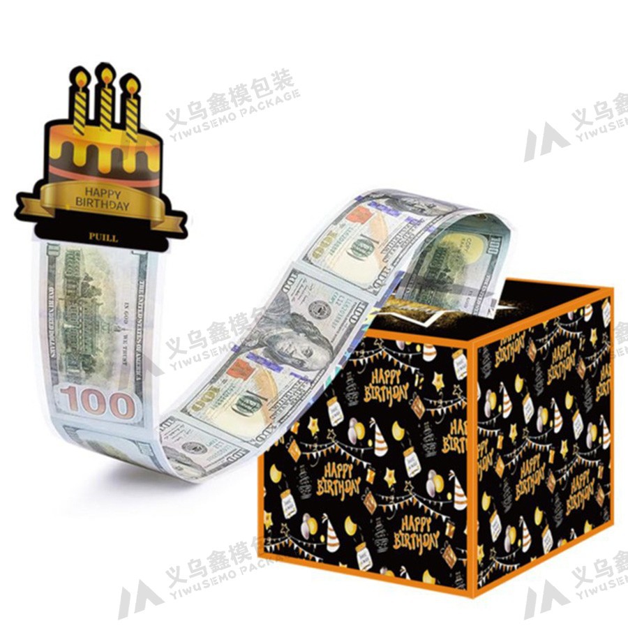 黒い金のケーキのカードの誕生日のサプライズプレゼントはお金の箱の誕生日パーティーの装飾品を引き出します。
