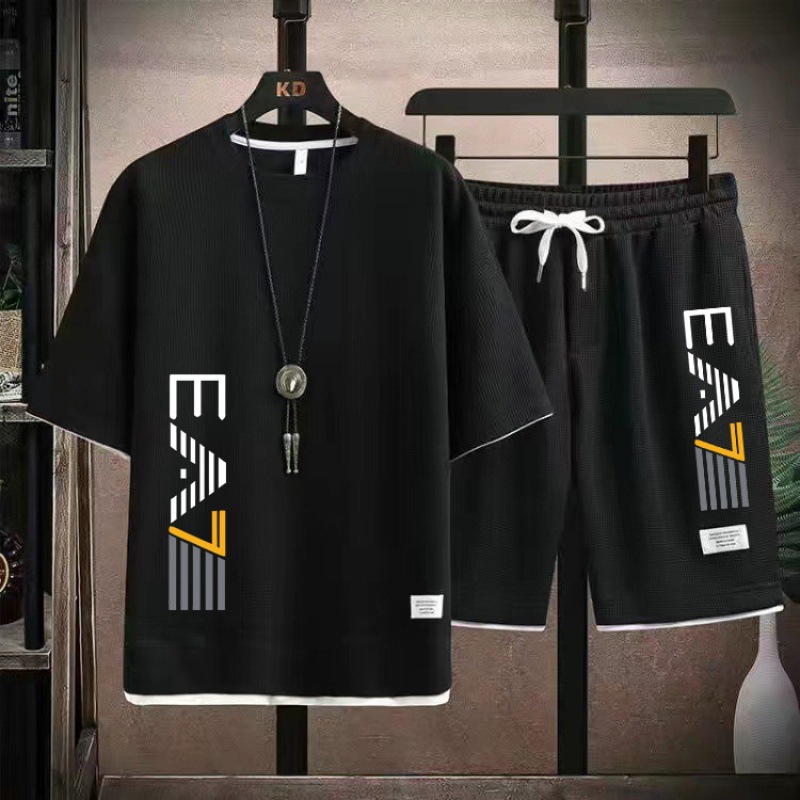 ワッフルtメンズ香港風メンズ偽2枚セットカップルゆるいトレンド大きいサイズ5分ズボンアウトドアカジュアル