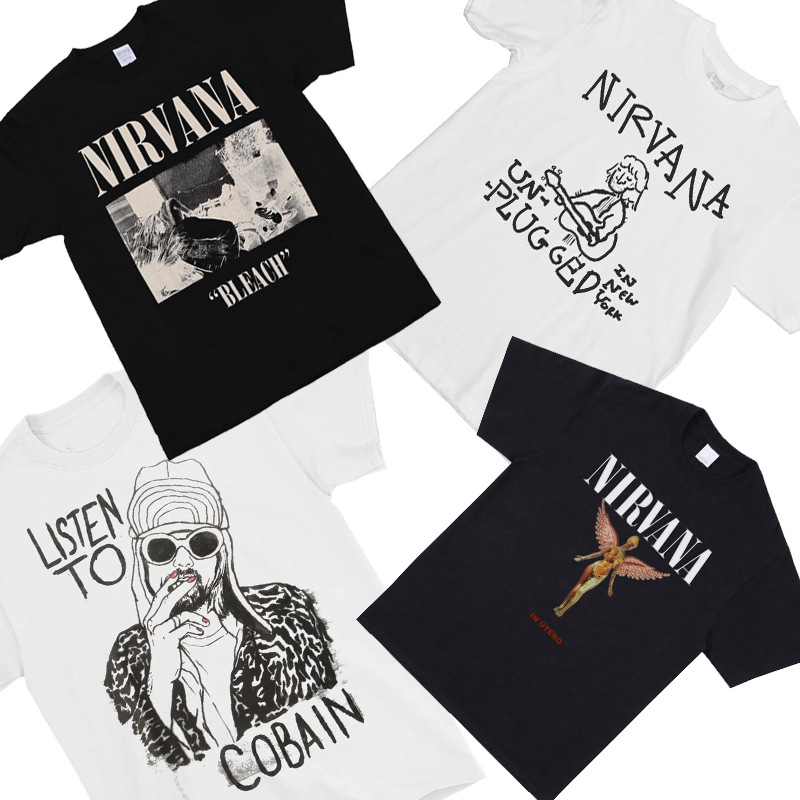 Nirvanaロックバンドの涅盤は古いレトロな半袖tシャツをします。