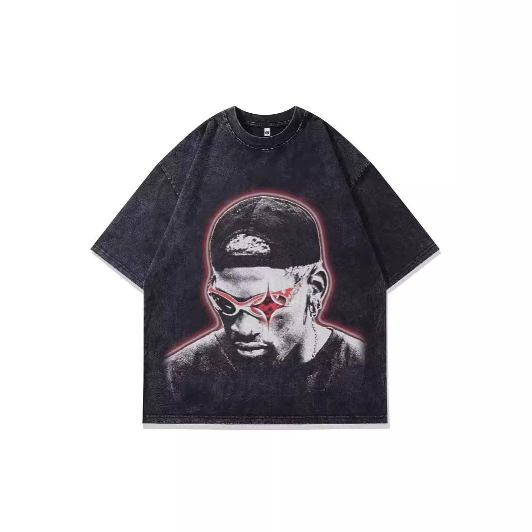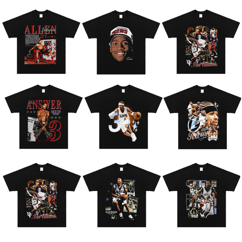 アレンIversonアイバーソン半袖のアメリカ式の小さい襟元の重いポンドは古い両面の通気性のプリントの長さをします。