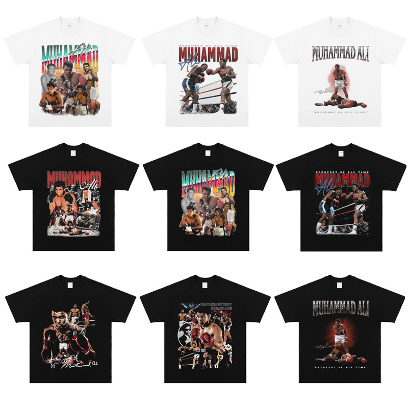 200g生地綿T欧コード拳王アリaliボクシング運動Ali復古プリント水洗い