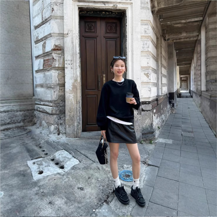 黒い腰の高い皮のスカートのa字版の半身のスカートはお尻の高級感を包んで、秋冬の女性の2024新型のファッションの洋風は爆発します。