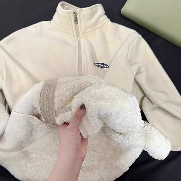 両面のフリースのコートの女性は秋冬の晩秋の初冬に中に突撃服を着て毛の中の胆をつかんで襟を立てます。