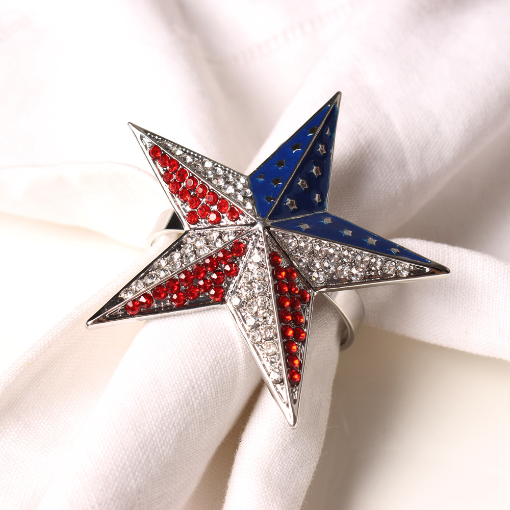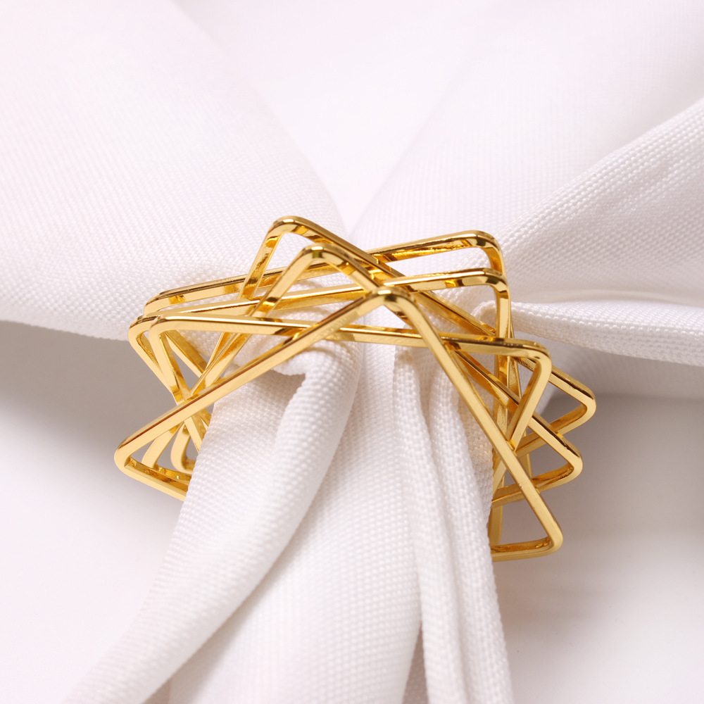 国境を越えた卸売り金属メッキのアイデア立体五角星ナプキンリングホテルの宴会は不規則なナプキンを並べている