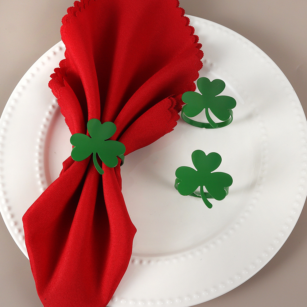 アマゾンの新しい油を垂らした緑の幸運な草のナプキンリングのレストランの合金の電気めっきの愛のクローバーのナプキンのボタン