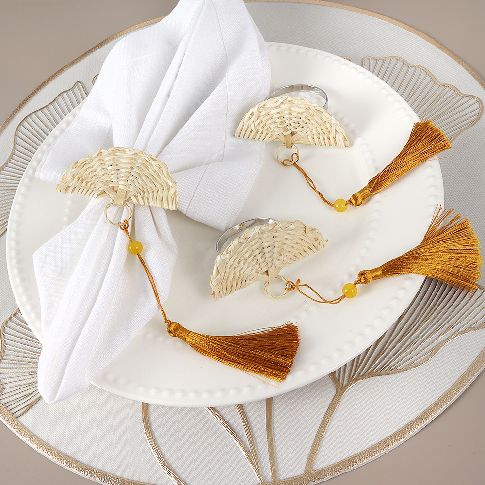 創意的な手作りの藤編みの扇子の流蘇のナプキンのリングの金属の電気めっきの扇形のナプキンはホテルを掛けて台のメーカーを並べて卸売りします。