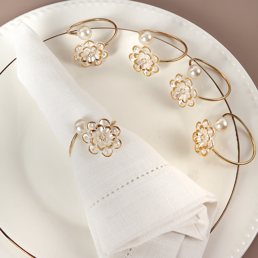 国境を越えたアイデアの新しいバレンタインデーのシンプルな花真珠開口ナプキンリング金属メッキホテルの置物卸売り