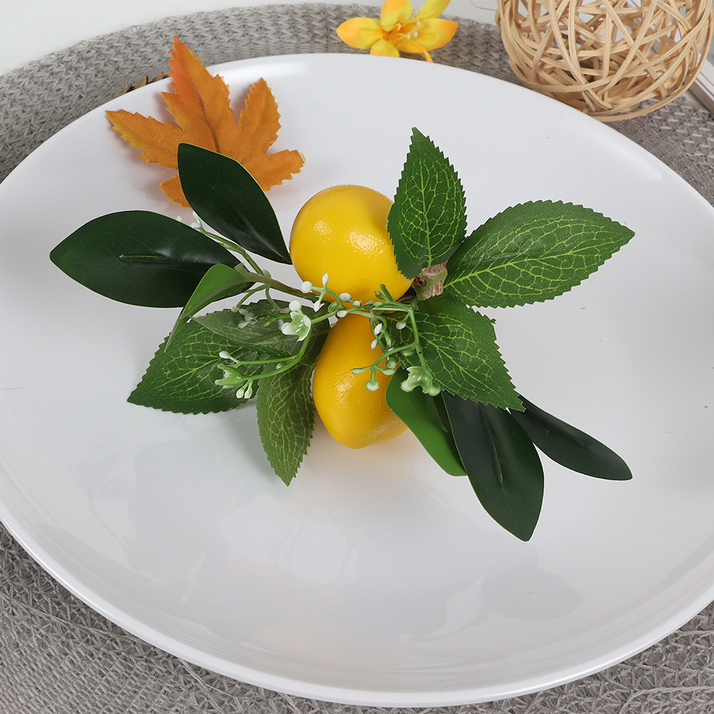 新商品の手作りシミュレーションレモンティッシュリングホテルのレストランでテーブルを並べて果物シリーズのナプキンを掛けます。