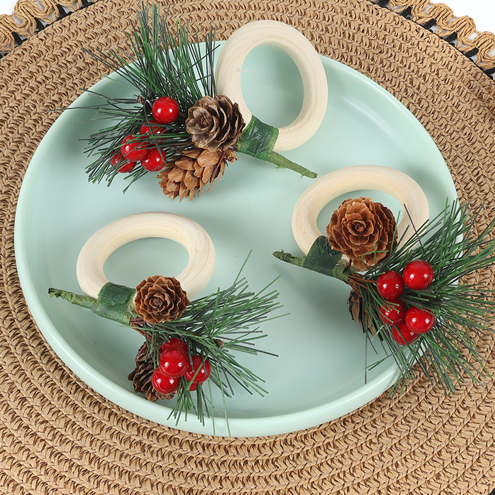国境を越えて新しいクリスマスシリーズの赤い果松針ナプキンリングホテルの宴会は台を飾って木のリングのナプキンを飾ります。