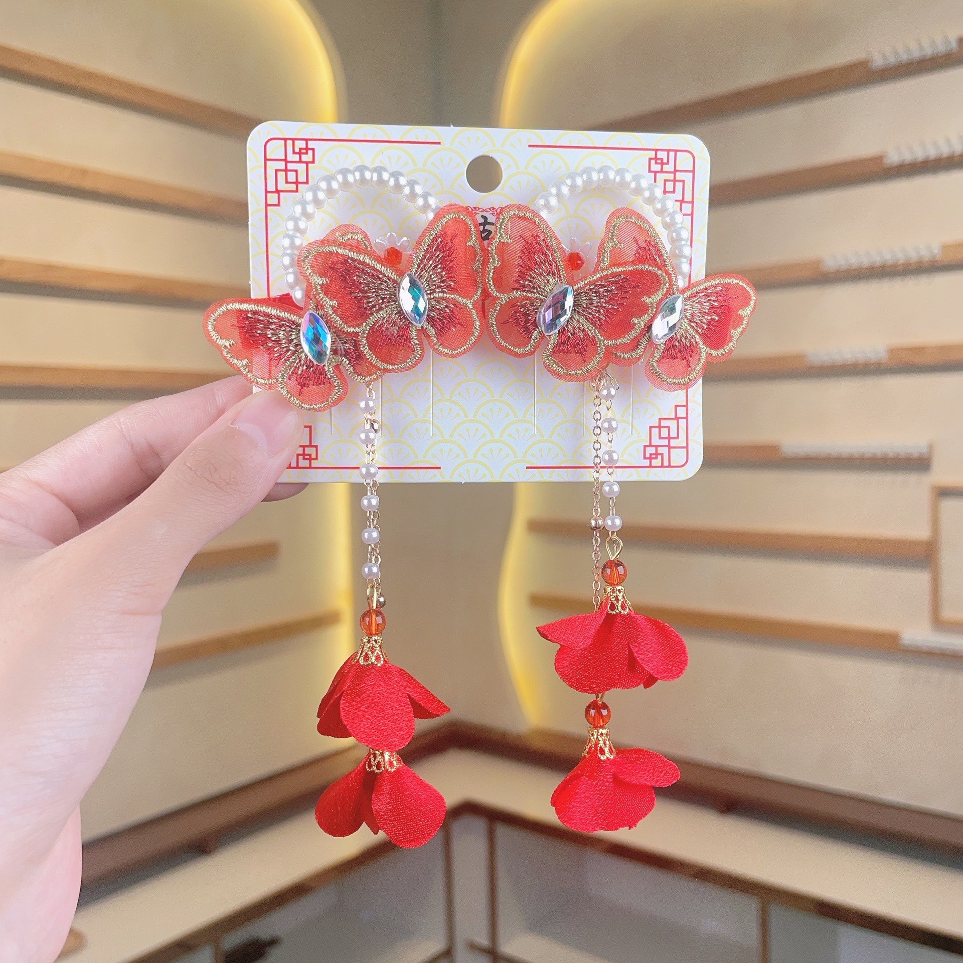 子供の新年の漢服のヘアピンの女の子の赤い蝶のお祝いの古風の髪飾りの女の子の中国風のフリンジの髪飾り