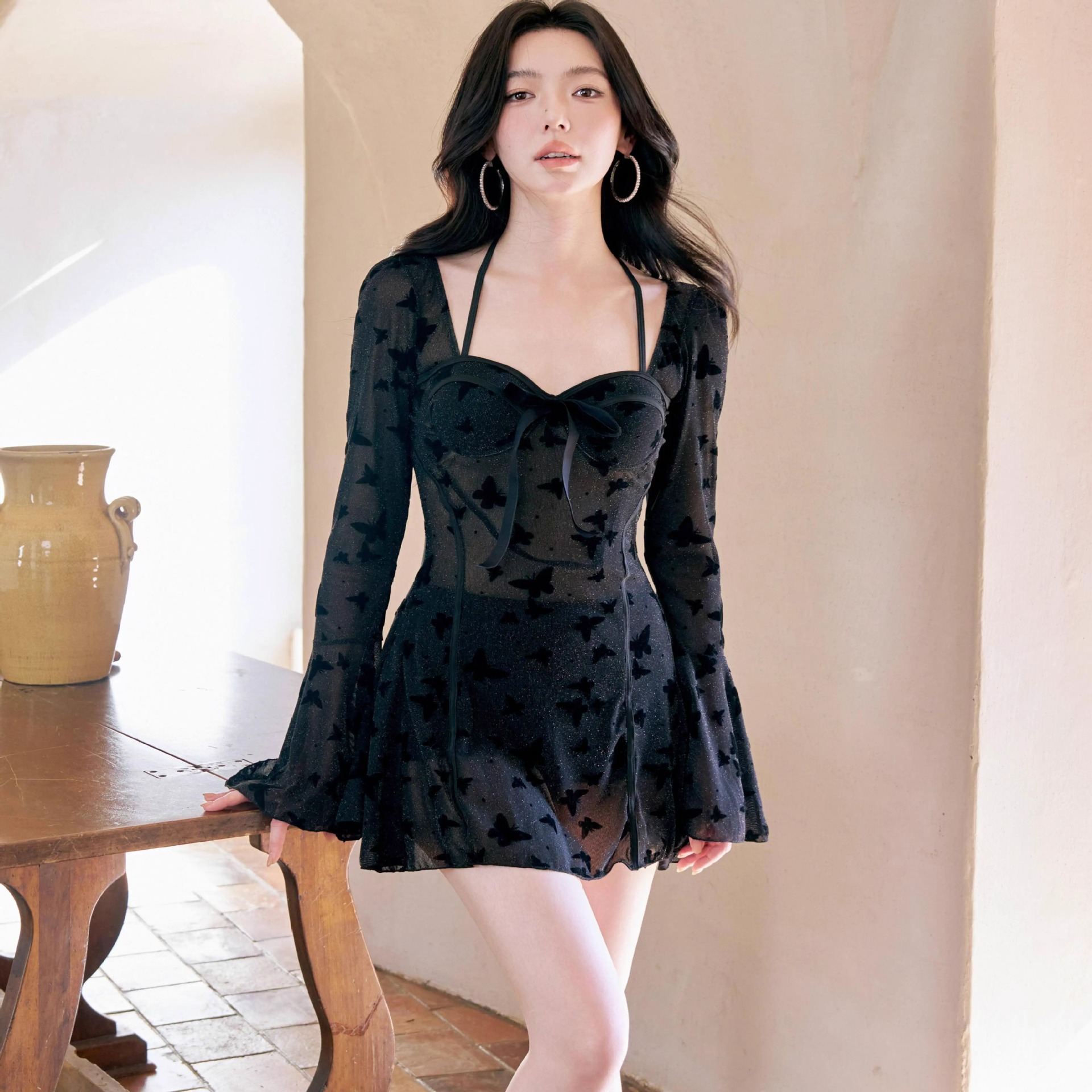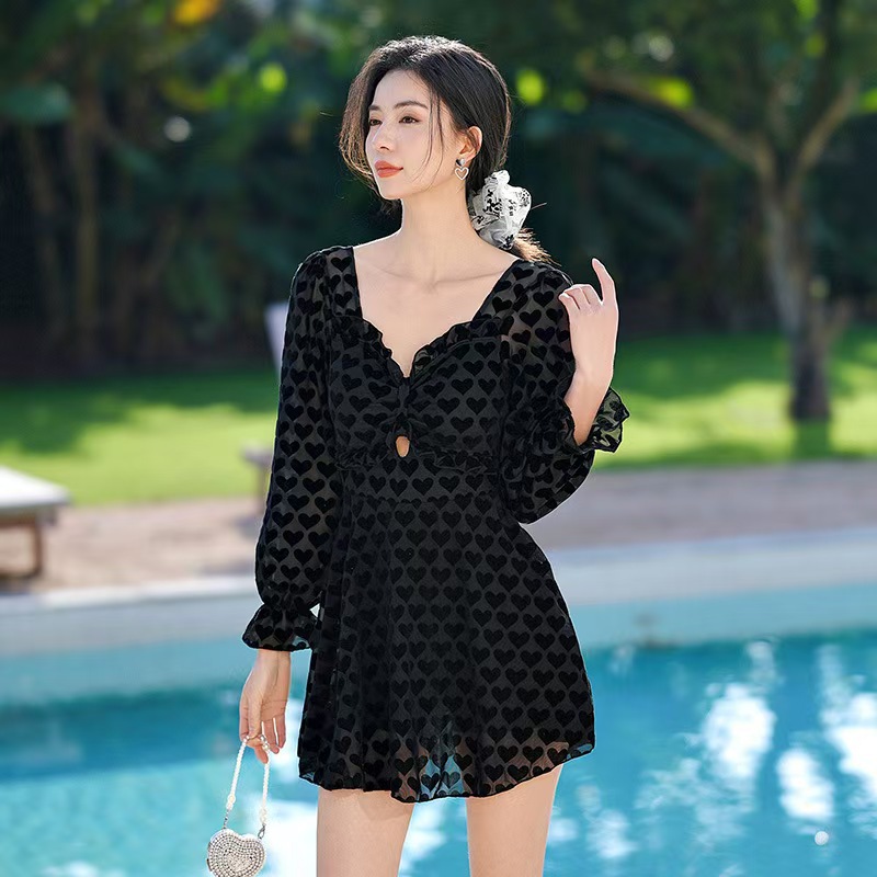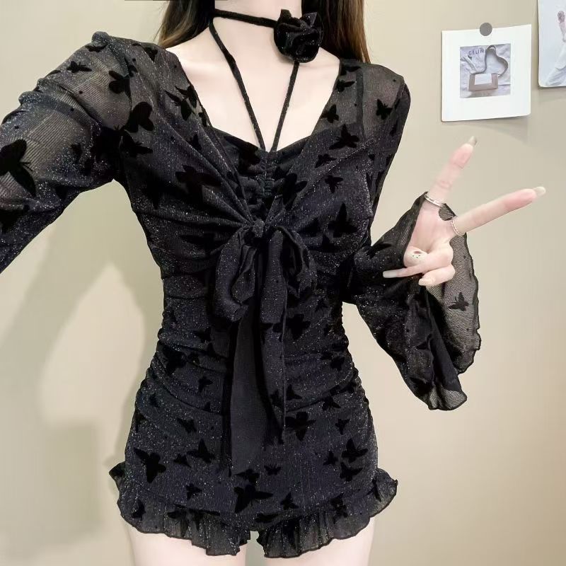 2025新型水着の女性の連体は肉を隠してやせている黒い蝶の長袖のブラウスのセクシーで美しい高級感があります。