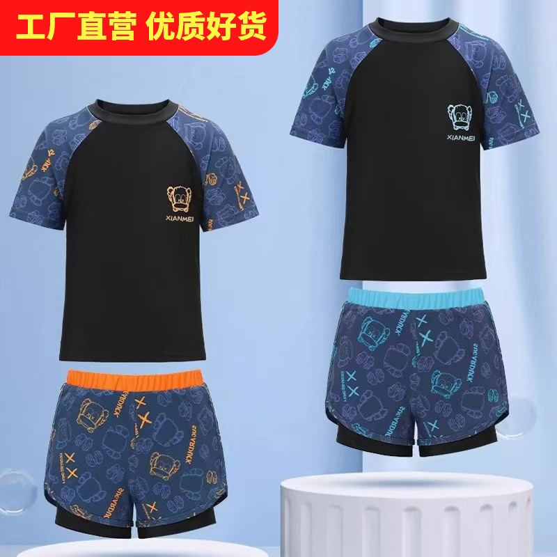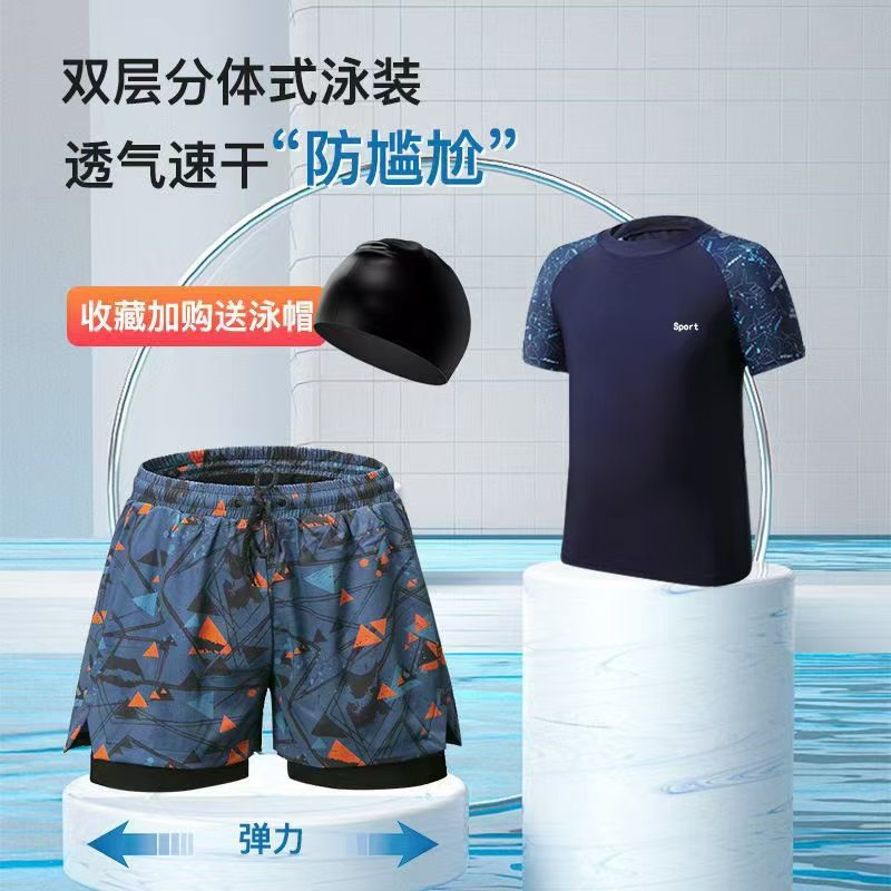 子供の水着の男の子は体を分けて2025新型の男の子の水着の中で大きい青少年の夏の二重の水泳のズボンのカバーの装備を分けます。