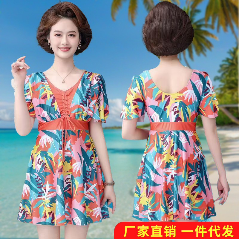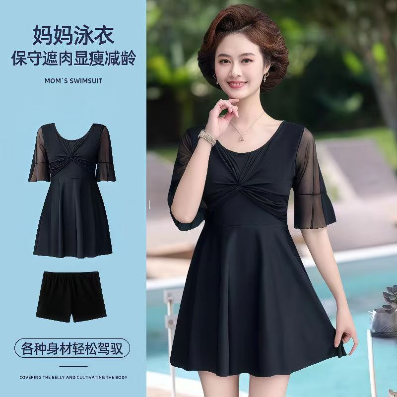 女性の水着の中で高齢のお母さんのタイプは腹を遮って痩せています。