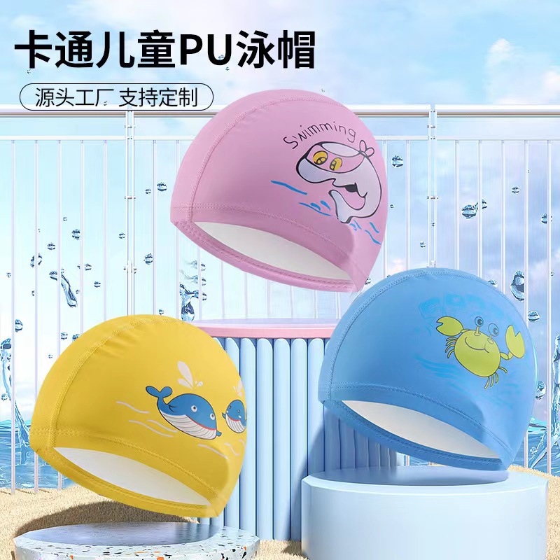 子供用水泳帽かわいいプリントPUレイヤー水泳帽防水耳保護男女共通PU水泳帽卸売り
