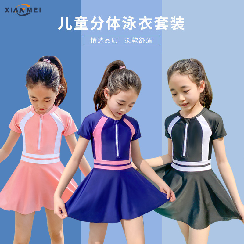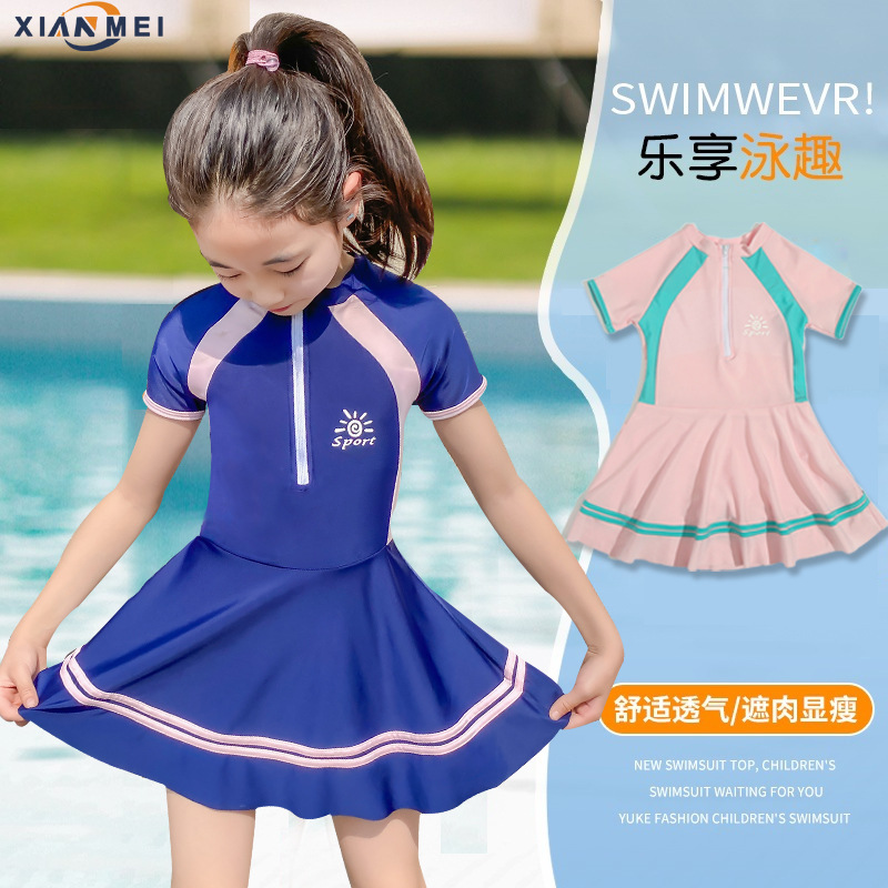 子供用水泳パンツの水着の女の子の赤ちゃんの半袖のワンピースの女の子の中の大きい子供の韓国の王女のスカート式の温泉の水着